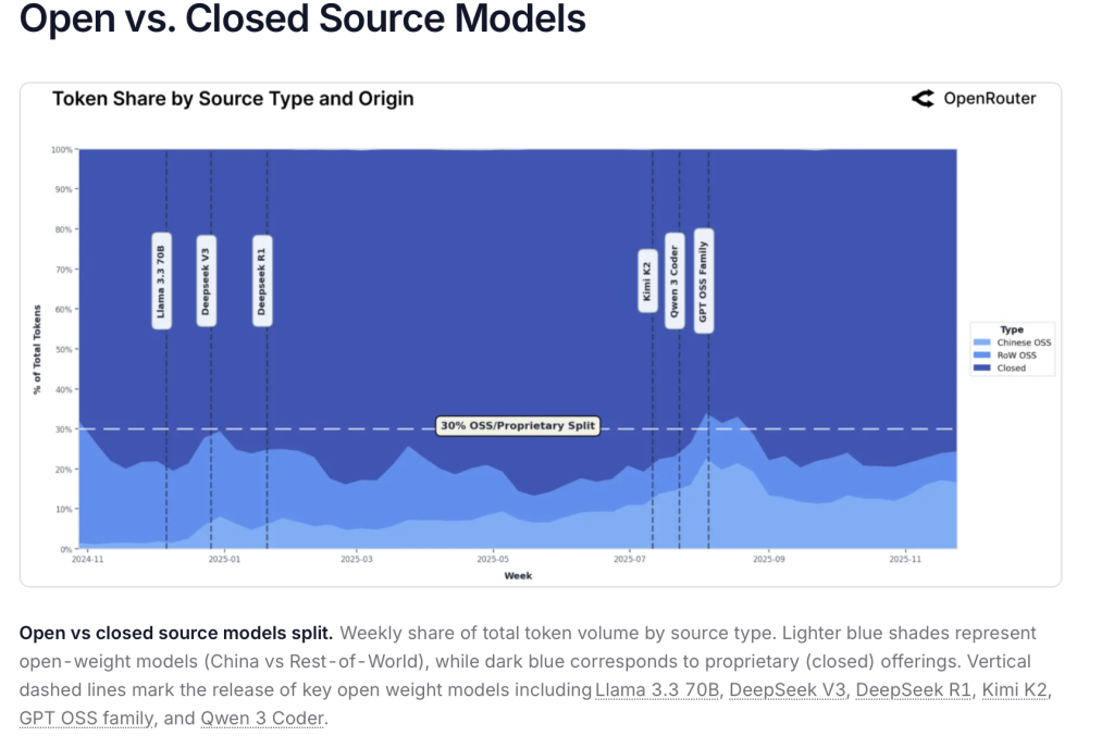 Another major revelation: Chinese AI models now account for approximately 30% of global usage—nearly triple their 13% share at the start of 2025.