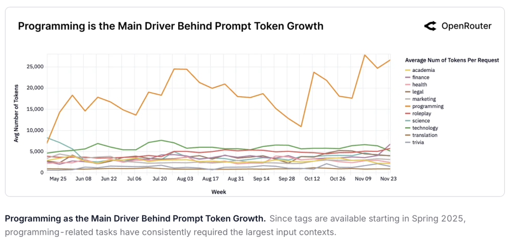 This growth reflects AI’s deepening integration into software development. Average prompt lengths for programming tasks have grown fourfold, from around 1,500 tokens to over 6,000, with some code-related requests exceeding 20,000 tokens—roughly equivalent to feeding an entire codebase into an AI model for analysis.